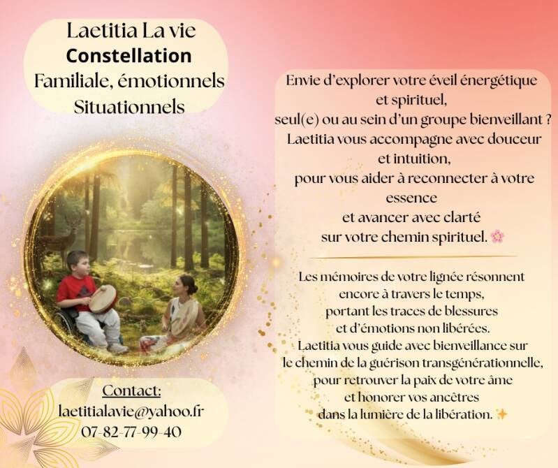 Grâce aux constellations familiales, émotionnelles et situationnelles, Laetitia vous aidera à mettre en lumière ces héritages inconscients et à retrouver votre équilibre intérieur.